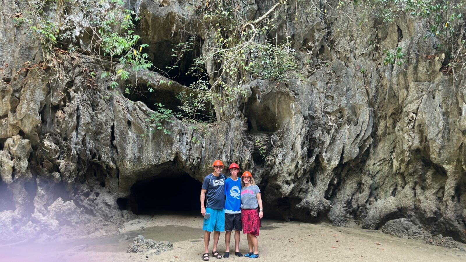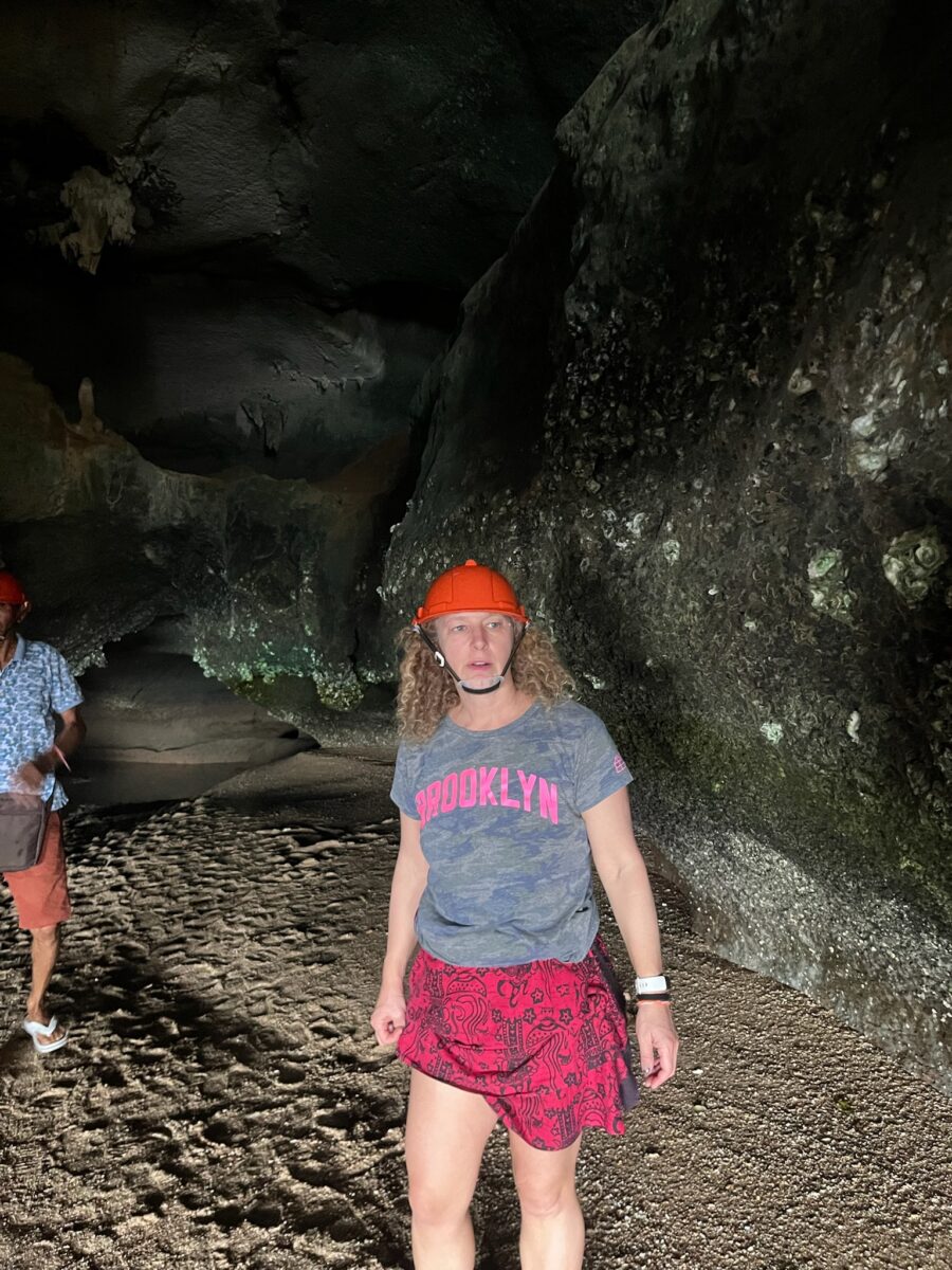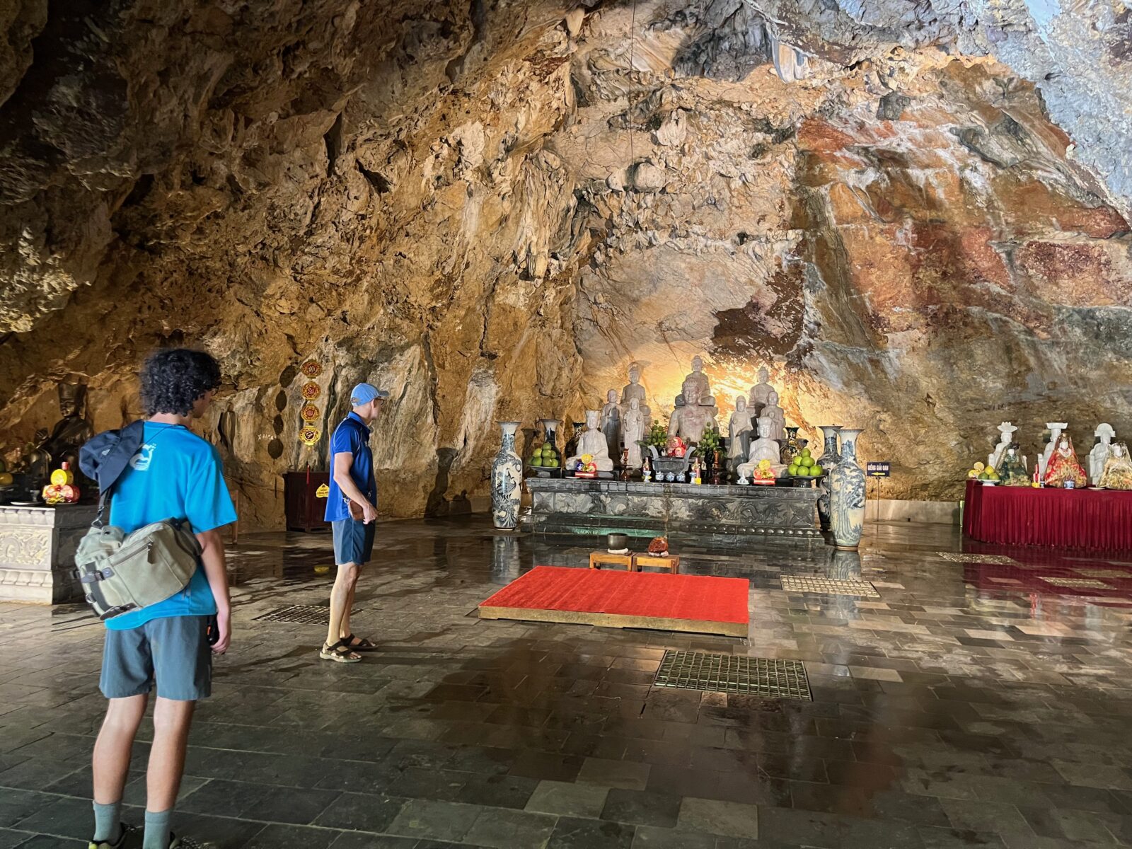 The next morning We rented scooters and headed out. Being out, exploring the beautiful countryside lifted my tired spirits. It was really beautiful. We went to check out a humungous cave that the a couple villages all hid out in during the war. It was humungous! You had to climb up to the cave. From there the people also had a great look out. Afterwards we climbed down from the cave. Below there was a lake and people were having lunch and hanging out. I had read people tubed in a nearby cave but couldn’t figure out where. Eventually we saw an opening – but no one was going in it. Dan and I decided to swim in and check it out. It, like the cave above – went on endlessly. It was amazing. There were ropes to help you find your way out again. We had to get Morton to see it. He thought it was a bit creepy, but agreed to try it on an inner tube.Morton at the cave entrance.And inside.