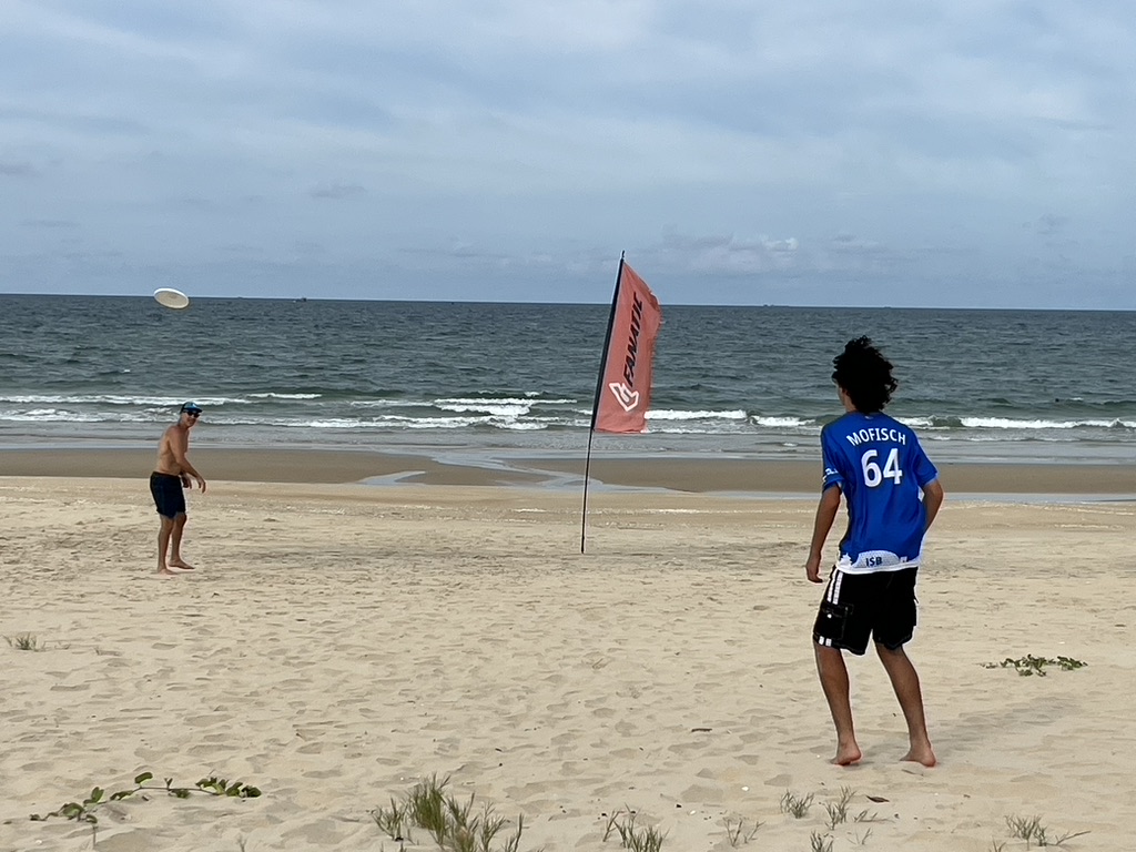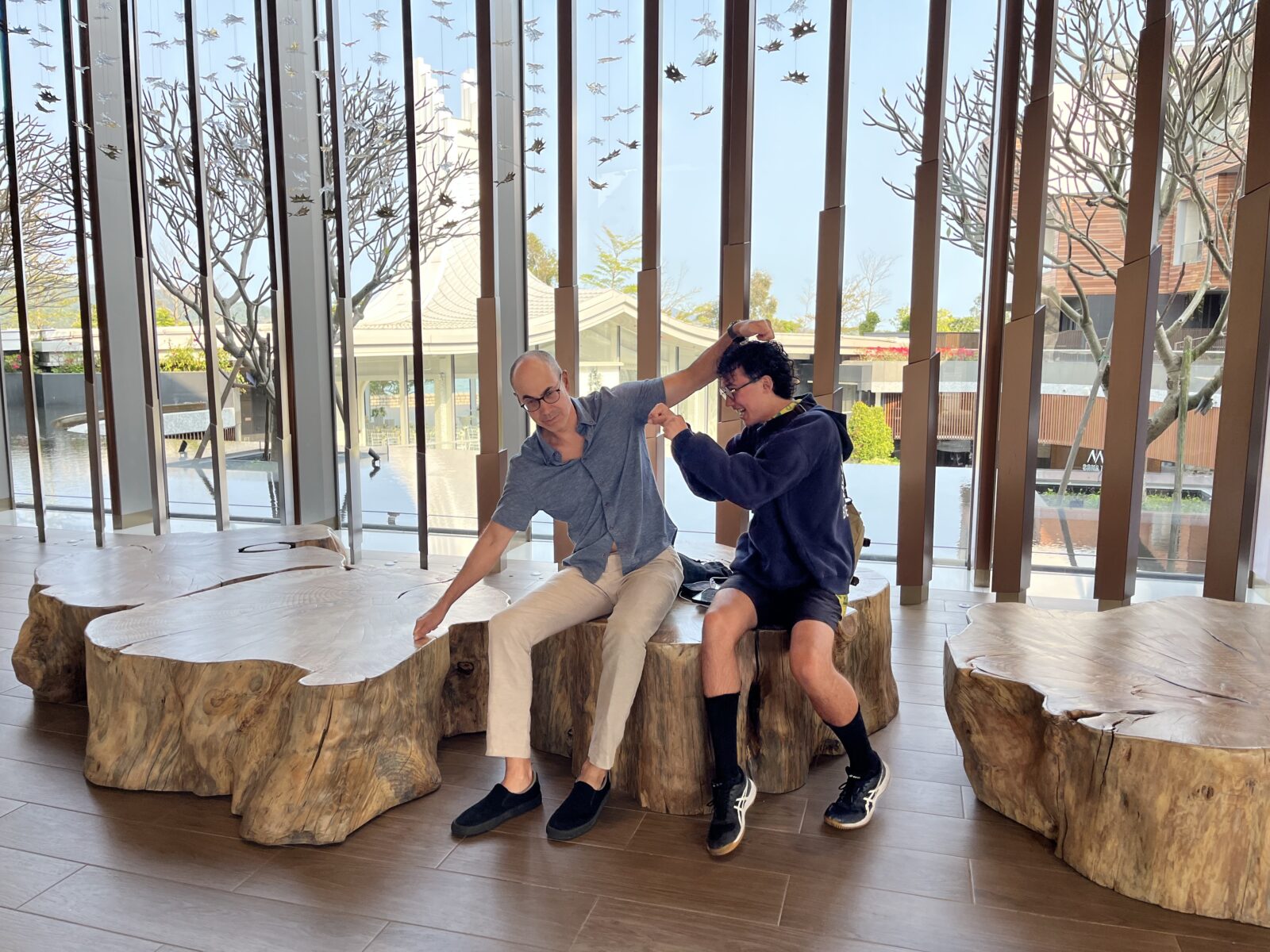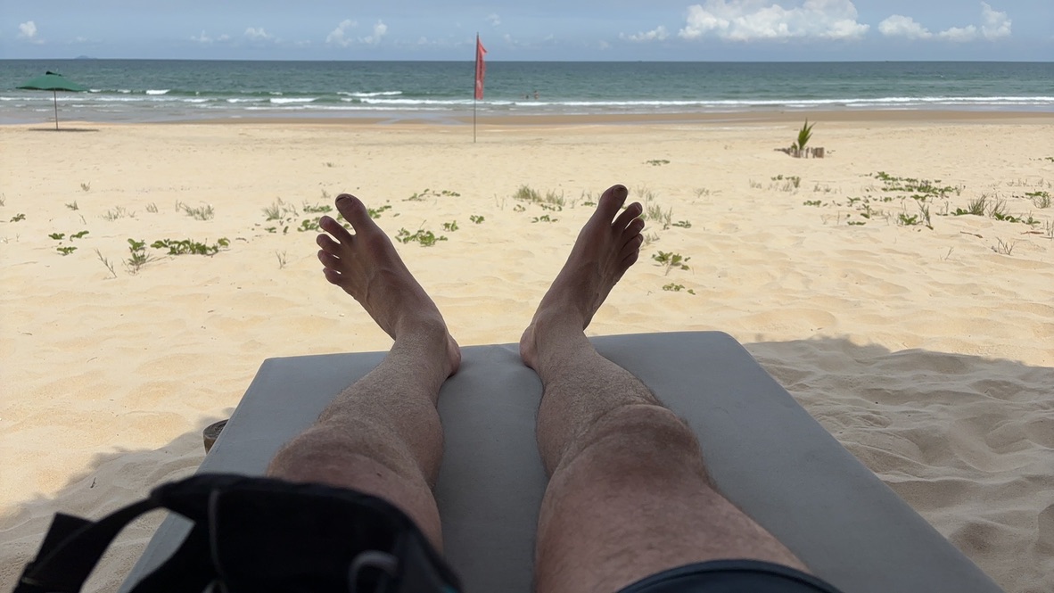 We spent a few days at this hotel. Relaxing, enjoying ourselves. We enjoyed the gym overlooking the ocean, sitting by the pool. I went on a long swim in the ocean, and the boys tried to catch a volleyball game down the beach but ended up just passing the ball between themselves. The second night we went to the hotel’s lovely looking restaurant overlooking the ocean. We had a nice evening, but we had to keep ordering things until we found things on the menu they actually had.Morton sitting in front of his bungalowDan enjoying the sunset by the pool on the ocean