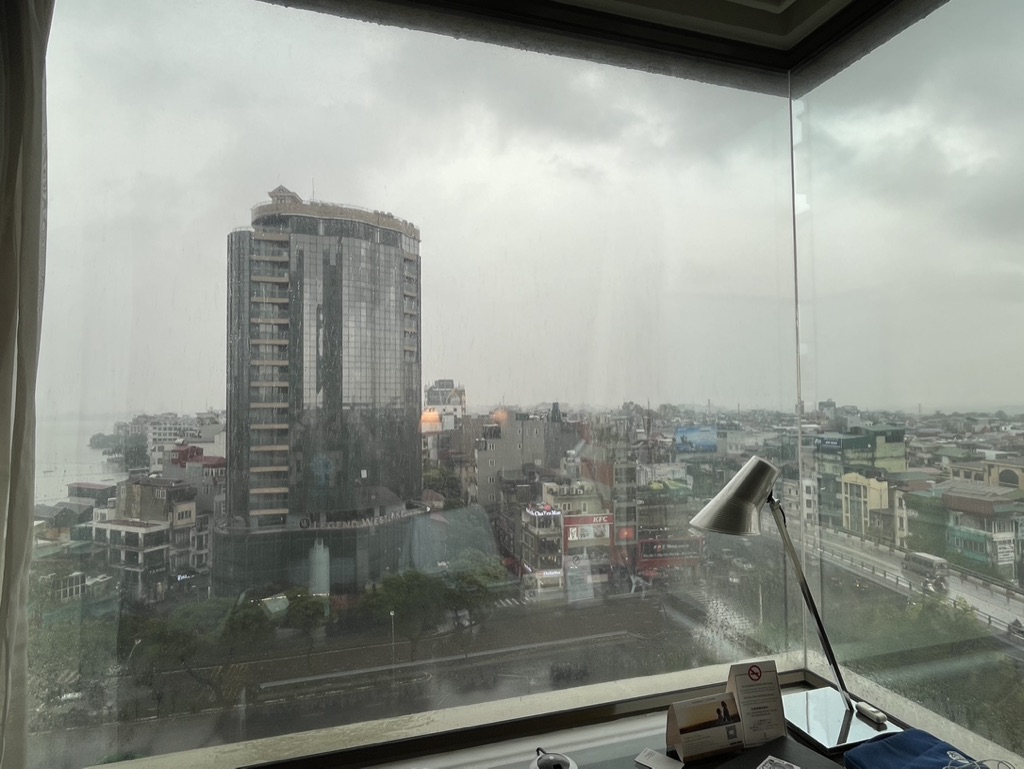 The next morning we woke to hearing something breaking. The entry way to the hotel came crashing down (along with the hotel internet and phone service). This was when we were happy to be in the second row. The ocean was slamming against the hotel. We were supposed to take a 6am ferry the next day in order to make our flight out of Cambodia. I went to the desk and they told me that no ferries were running and whenever one went, we should probably get on it. We headed to breakfast on the hotel deck, people sitting near us got pummeled by splashing waves. – and so funny – the hotel kept the pool/beach towels on the deck – they continued to put the towels there even as they were getting pummeled by the storming ocean.