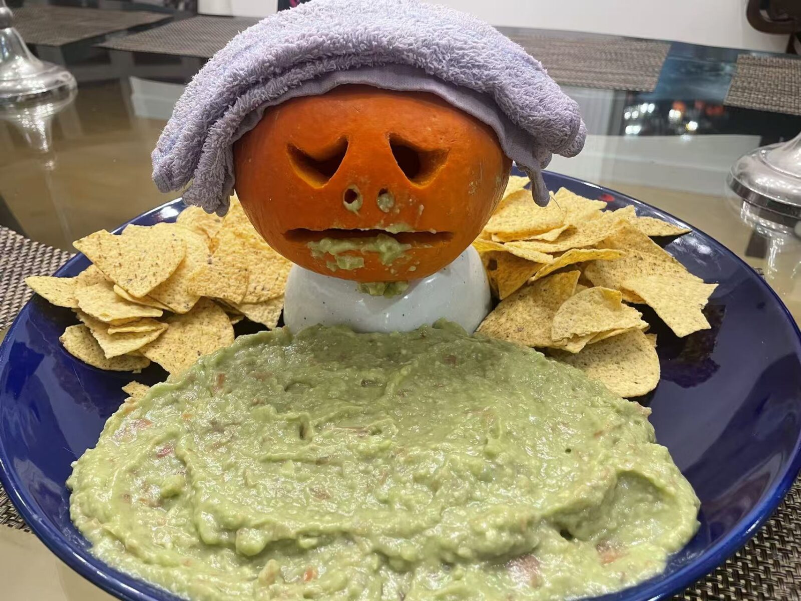 Preparade hangout in Dan’s officeDan, Yao Ming, and JerryFriends from Ukraine at their boothThat night we again went to Roberta and Ted’s. Our friend Michael made this pumpkin carving with his Guacamole. Pretty funny!
