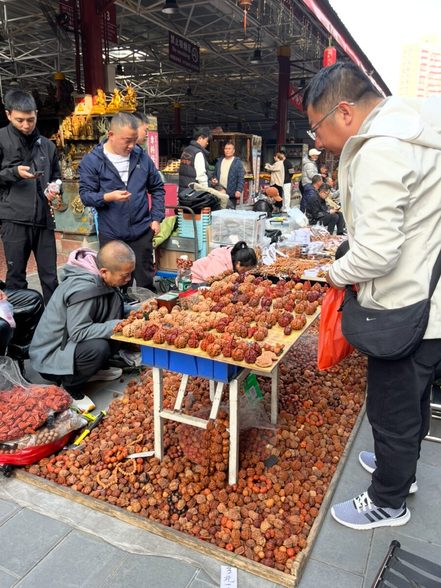 After haircuts, there is a fancy European style deli/bakery where we had lunch.Then we went glasses shopping (we were just being silly with these). Morton decided he wanted the exact same ones he already had. I convinced him to get them at the very least in a slightly different color.Then we went to this antique marketThis market was humungous and there was an entire large area which was packed dedicated to people buying this… fruit? And then they’d scrub them clean and keep the nuts. Some booths they would scrub for you – and others you could just buy the nuts. The final nuts for sale